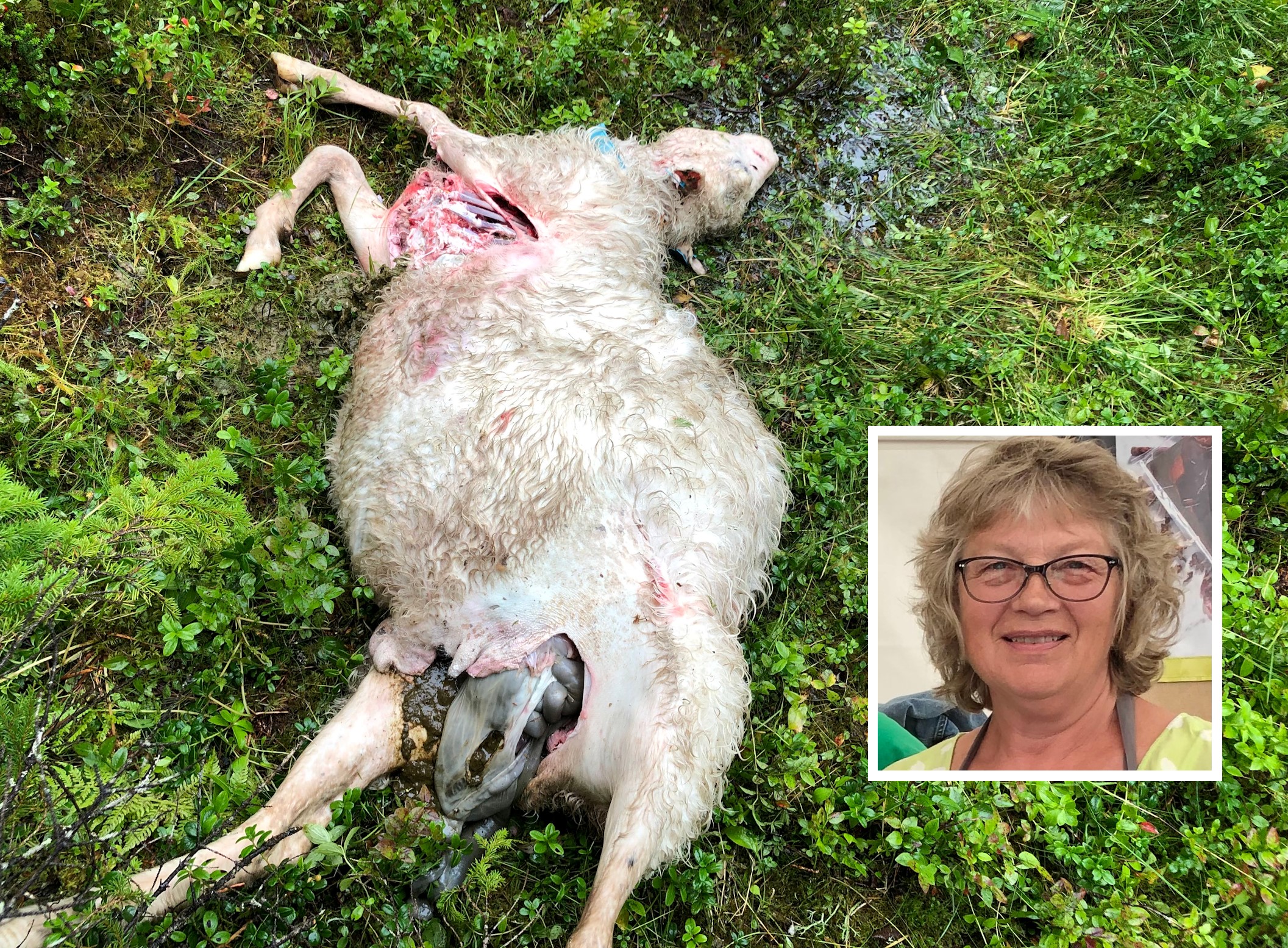 Bildet øverst i artikkelen viser et sauekadaver som ble oppdaget fredag morgen i Roktdalen. Innlfelt: Tone Våg. Begge bildene benyttes med tillatelse fra opphavsrettseier Tone Våg.