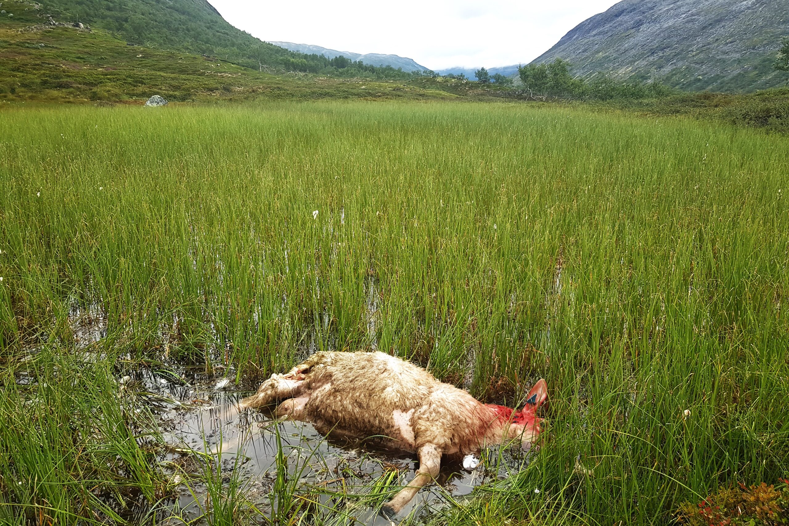 Bildet øverst i artikkelen viser et jerveskadd kadaver fra Rauma kommune i Møre og Romsdal i 2023. Foto: Svein Brunvoll